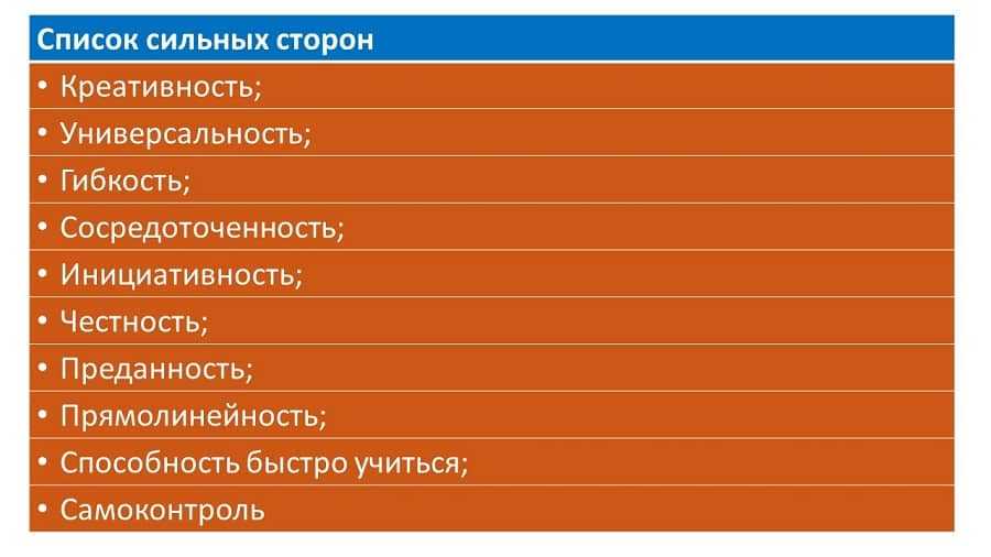 Даже самые опытные кандидаты испытывают сложности с ответом на вопрос об их сильных сторонах, поэтому мы собрали список примеров, чтобы помочь вам сочинить свой рассказ. Вы можете воспользоваться советами каждого из этих примеров, чтобы ваша история полностью раскрыла ваш потенциал и поразила менеджера по найму.