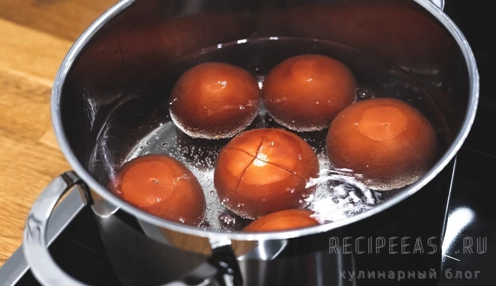 Чтобы быстро и легко очистить помидоры, необходимо опустить их на несколько секунд в кипяток.