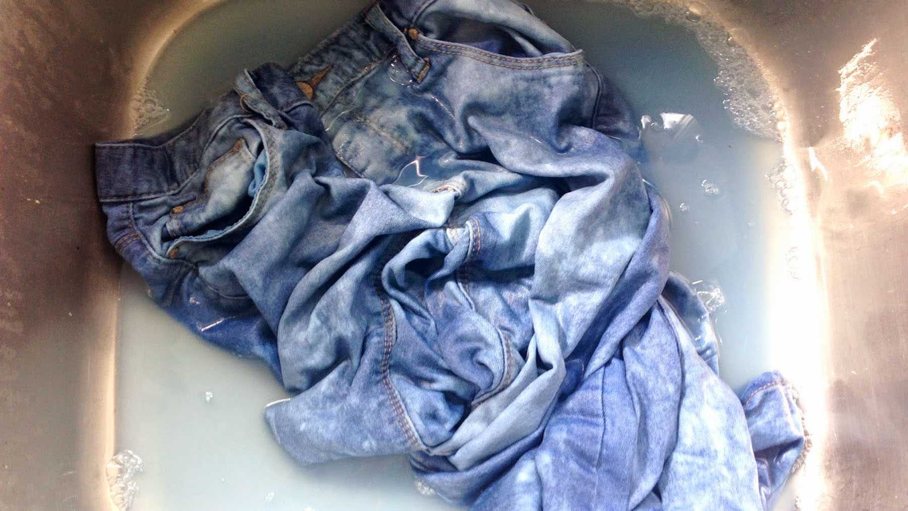 - очистить маркую вещь поможет пар: набрав ванну с горячей водой, закрыть ванную комнату и повесить джинсы на веревку; пары помогут вывести новые загрязнения.