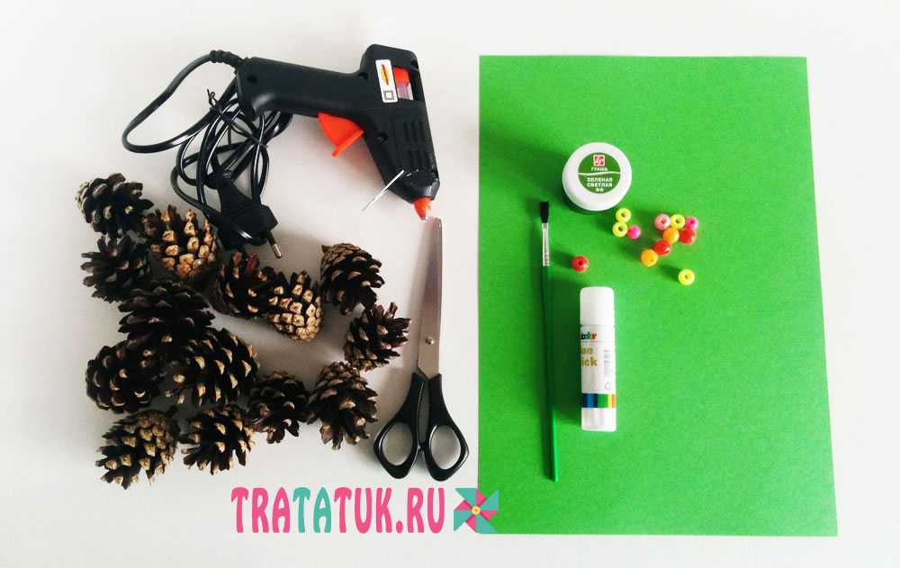 Эта малюсенькая елочка делается всего из одной большой шишки, только важно, чтобы она была полностью раскрыта, очень удобно заниматься данной поделкой с маленькими детками. Итак, материалы: