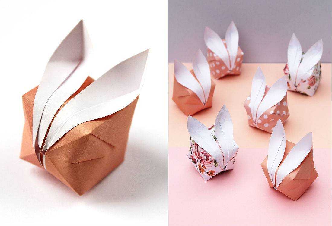Симпатичный зверёк, тоже сделанный на основе «водяной бомбы», подойдёт для украшения праздничного стола или в качестве милого сувенира. В него также можно спрятать небольшой подарок. Это – одна из простейших фигурок в технике объёмного оригами из бумаги, которая рекомендована начинающим мастерам. Для большего эффекта, лучше взять бумагу с разноокрашенными сторонами. Исходный квадрат может быть любого размера, но удобнее работать со стандартными 15х15 см или 21х21 см.