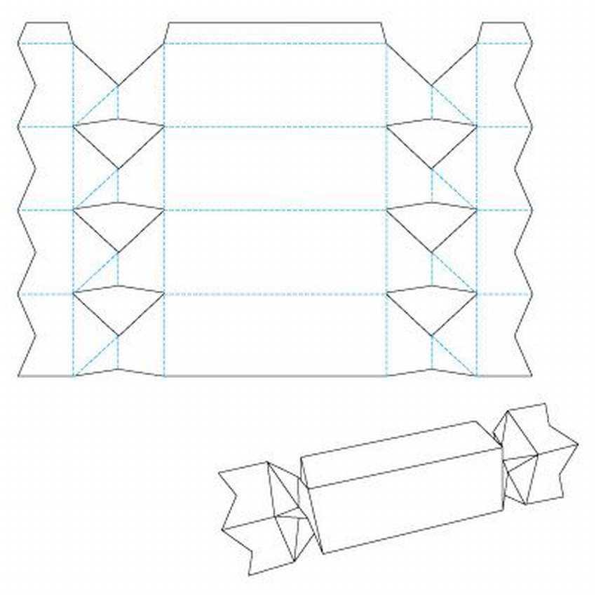 Своими руками делают бумажную конфету не только на базе цилиндра. Вырезая по чертежу из ватмана сборную конструкцию, получают не менее оригинальную упаковку для большого подарка.