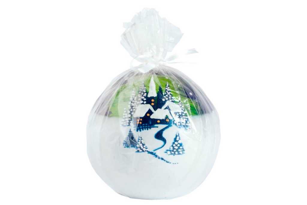 Одной рукой держат шар, другой накладывают с двух противоположных сторон салфетки, концы забирают в руку. Устанавливают «круглую конфету» в середину прозрачного листа, собирают боковые стороны, затягивают большим упаковочным бантом.