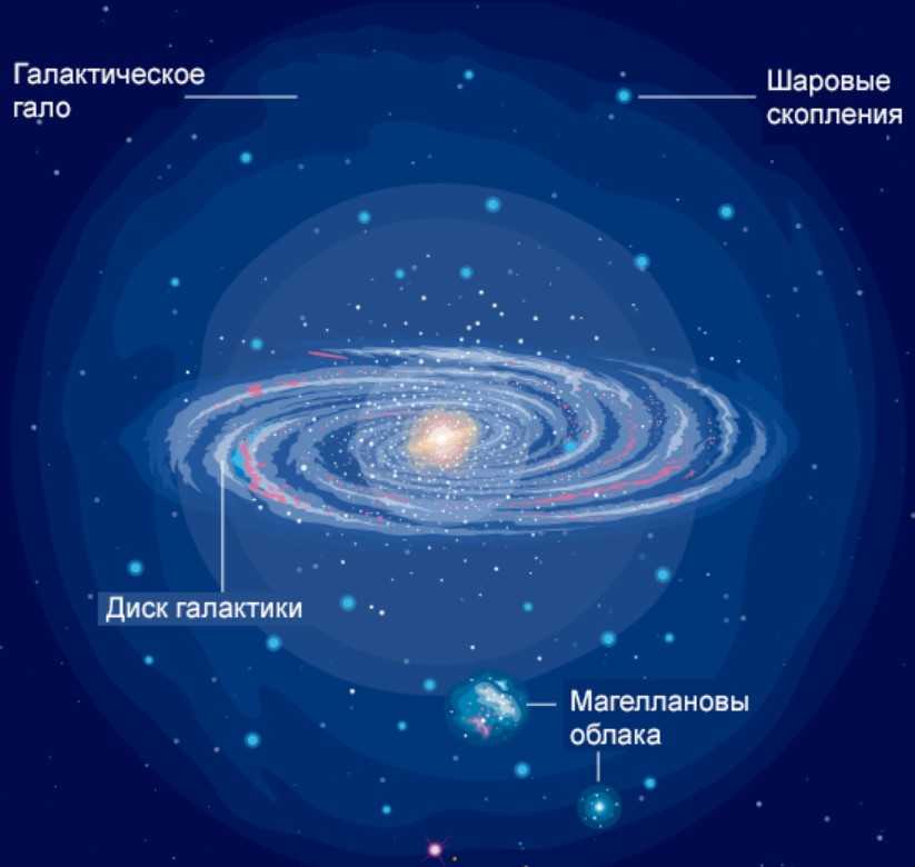 Эта часть имеет форму шара и выходит за его границы примерно на 5 – 10 световых лет. Температура гало – 500 тысяч градусов Кельвина. В его составе – старые, малые, малояркие звезды, а также шаровые скопления. Подавляющее большинство таких скоплений расположены ближе 100 тысяч от центра Млечного Пути, но некоторые шаровые скопления находятся на расстоянии более 200 тысяч световых лет от галактического центра. Центр симметрии гало полностью совпадает с центром диска Галактики.