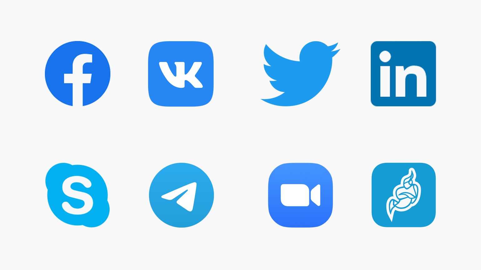 Иконки популярных социальных сетей и мессенджеров. Изображение: Facebook* / «ВКонтакте» / Twitter / LinkedIn / Skype / Telegram / Zoom / Jitsi Meet