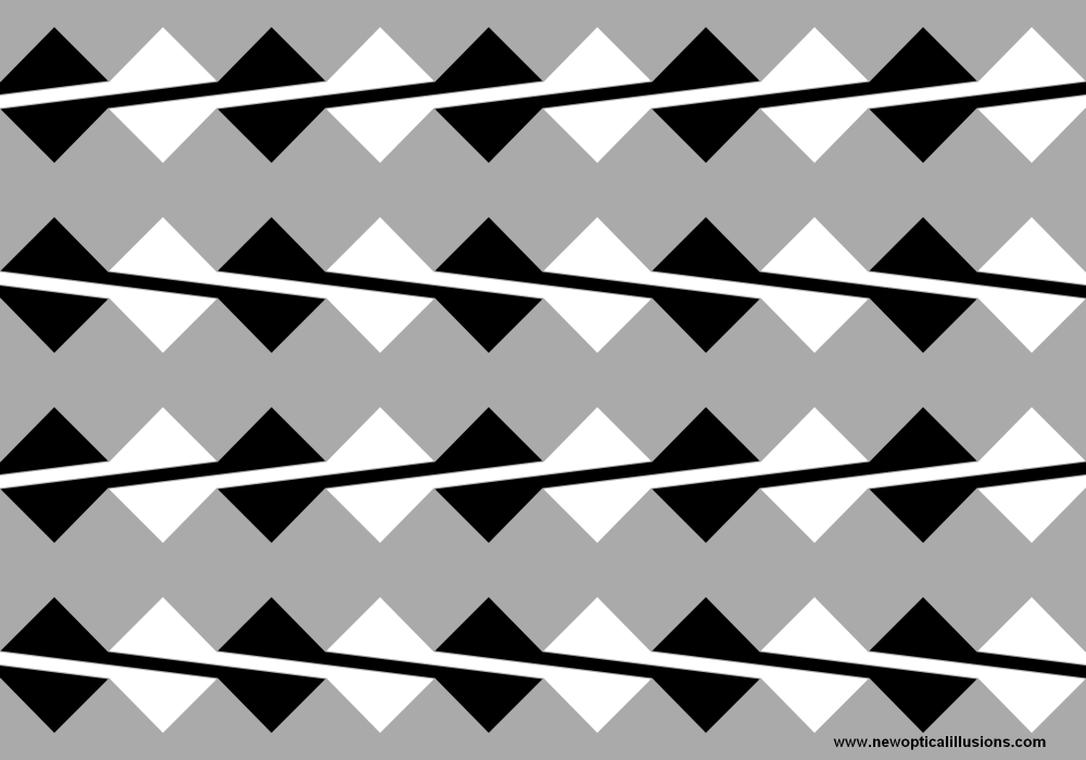 Это еще одна очень старая оптическая иллюзия, нарисованная американским психологом Орбисоном (Orbison) еще в 30-х годах 20 века. Красный ромб по центру – на самом деле идеальный квадрат, но из-за фоновых синих линий кажется, что он немного искривлен или повернут.