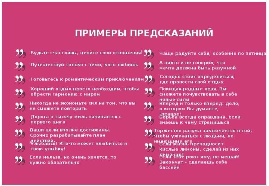Главная задача шуточных предсказаний — развлечение и поднятие настроения. Не стоит относиться к такой затее с излишней серьезностью. Однако бывали и такие случаи, что полученное предсказание в точности исполнялось.