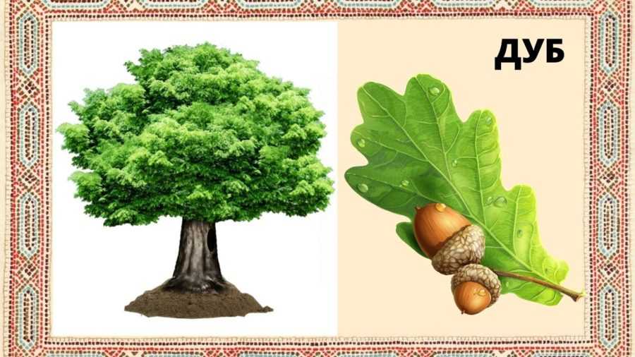 Дуб — крепкое дерево, символ мужской силы, здоровья и долголетия. Его плоды — желуди, которыми любят лакомиться олени и кабаны.