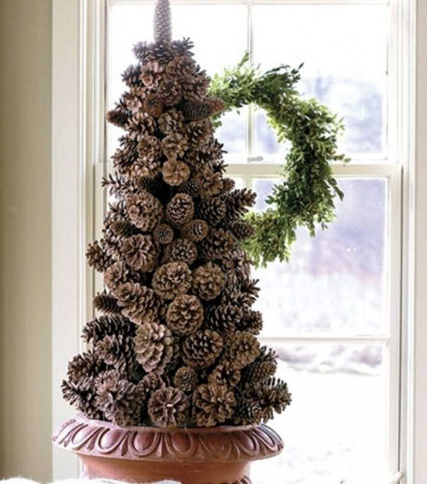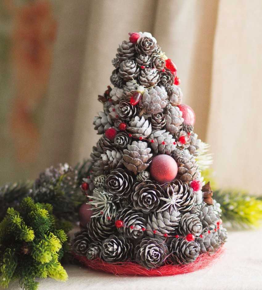 Можно разнообразить новогоднюю елку из сосновых шишек, используя декоративные крышечки, разукрашенные яркой золотистой или серебряной краской — получатся елочки в горшочках: