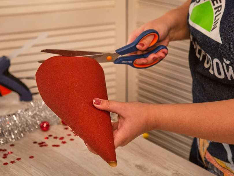 - Если конуса из пенопласта нет, то можно просто свернуть конус из картона, а для устойчивости наполнить его смятой бумагой или фольгой. Пенопластовому конусу необходимо на донышко приклеить круг из фетра, это будет основание елки.