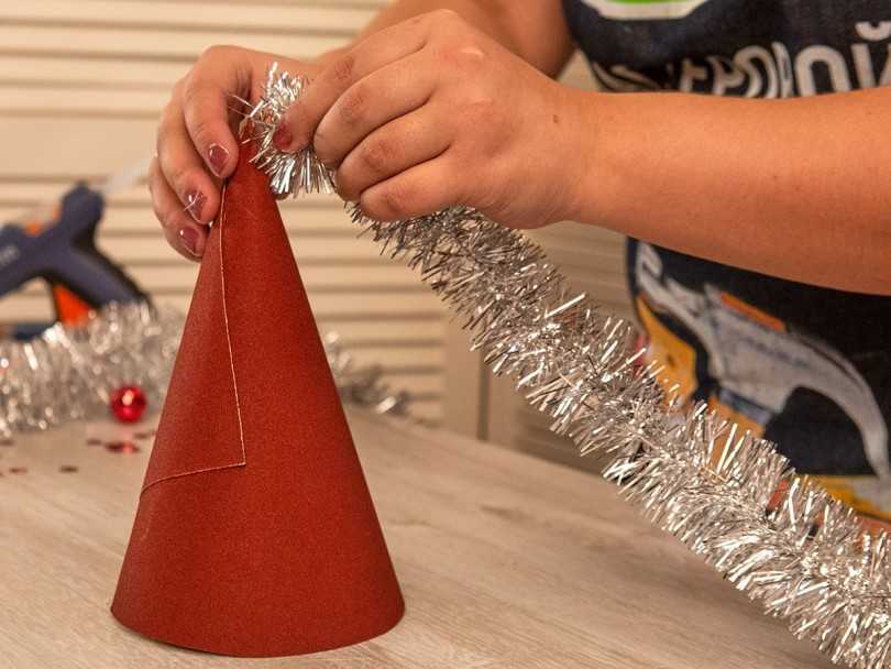 Изготовьте конусовидную заготовку из картона. Она будет основой для елочки. С боку в месте соединения бумагу нужно прочно приклеить, чтобы конструкция не распалась. Внизу срежьте ненужные части.