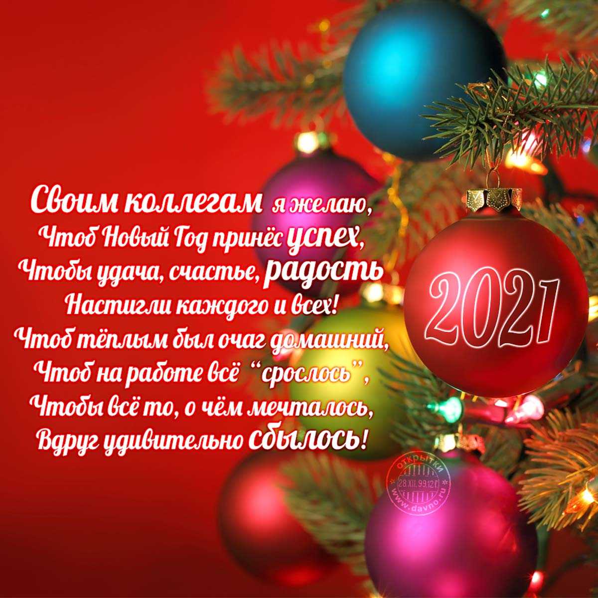 Открытка к новому году для коллег с красивым стихом. В центре картинки стихотворение, красный фон, наряженная ёлка.