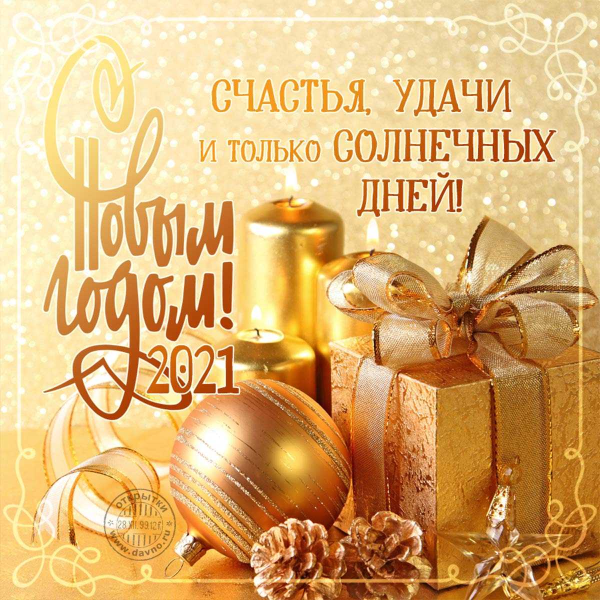 Одна из самых популярных открыток на Новый Год! Традиционная композиция из новогодних подарков, елочных игрушек, золотых лент, свечей и шишек. На фоне золотые блестки. Подпись на открытке: счастья, удачи и только солнечных дней!