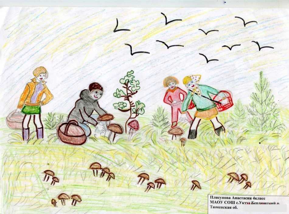 Грибы любят рисовать юные художники. Они могут быть реалистичными и сказочными, большими и совсем маленькими. На картинке ниже, много маленьких белых грибов, которые собирают дети.