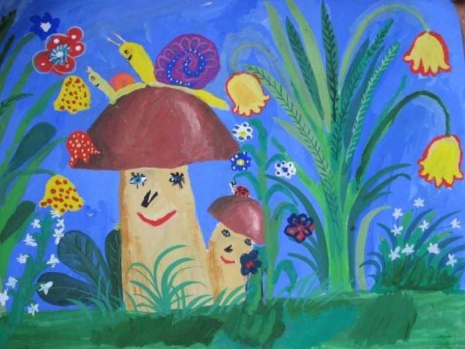 Ниже ещё один рисунок, на котором грибы — центральная часть композиции. Грибы на нем растут в волшебном, сказочном лесу. Видимо это грибная семья: мама и дочка.