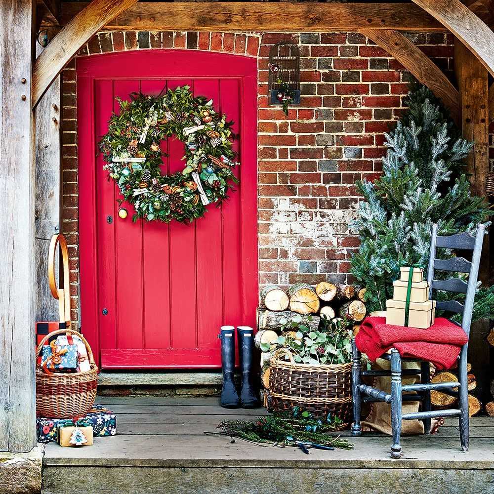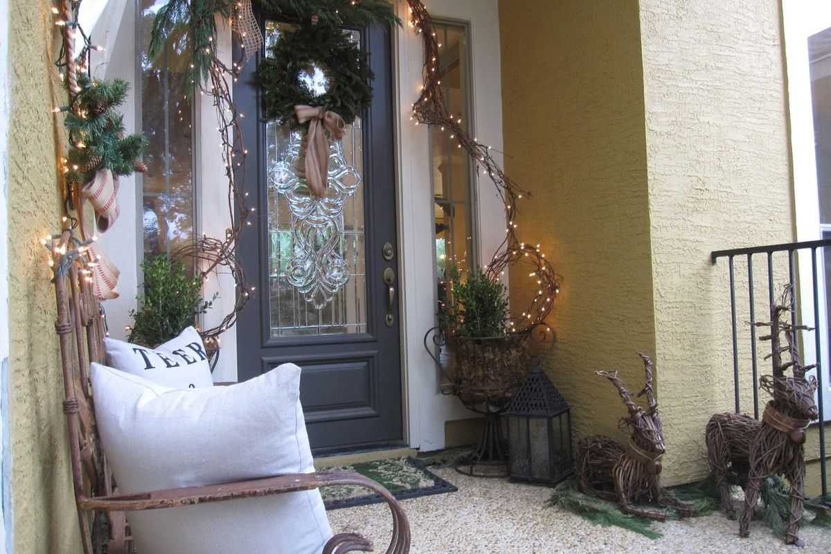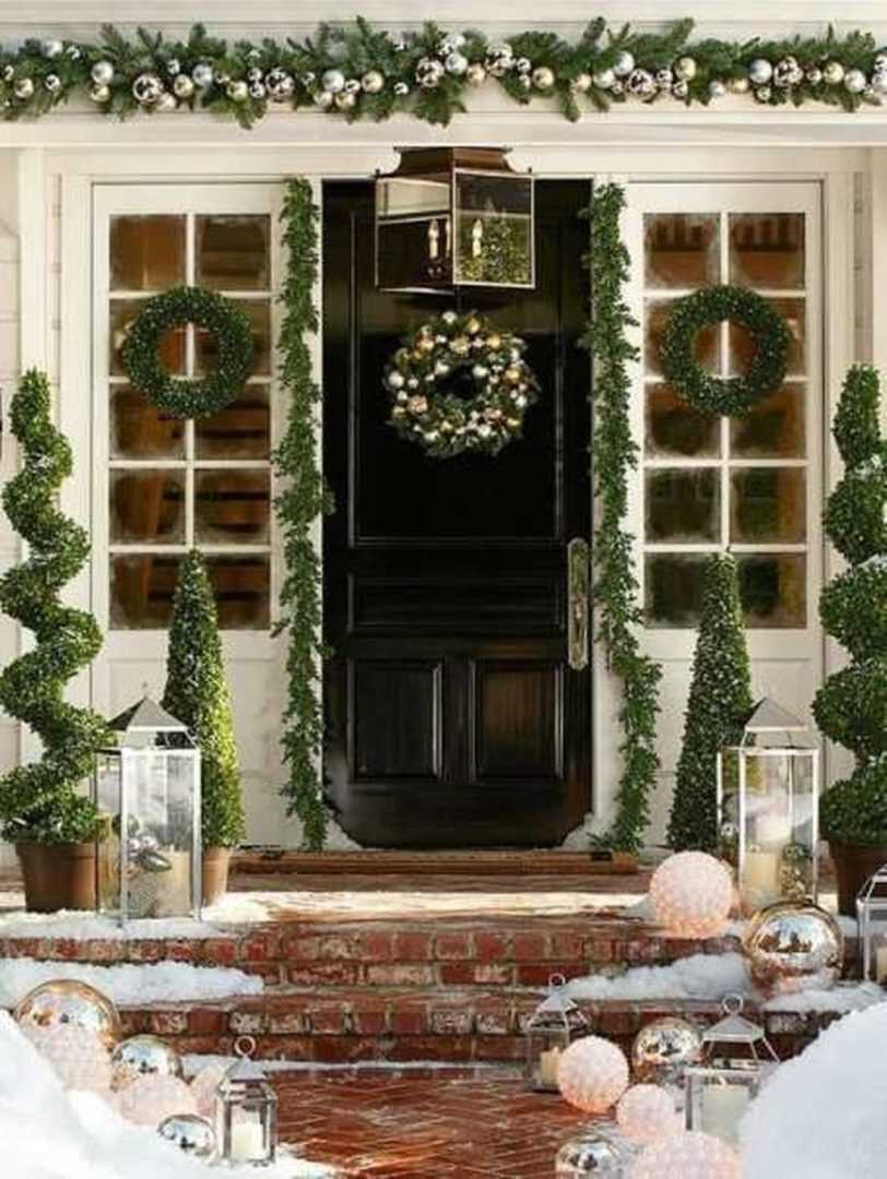Не стоит забывать, что внимания требуют фасад дома и крыльцо. Беспроигрышный вариант – сверкающие гирлянды. Стильно они будут смотреться не только на крыльце дома, но и на крыше. Входную дверь украшают не только венками, но всевозможными декорациями из шариков, пластиковых фигурок, лент, искусственных еловых веток.