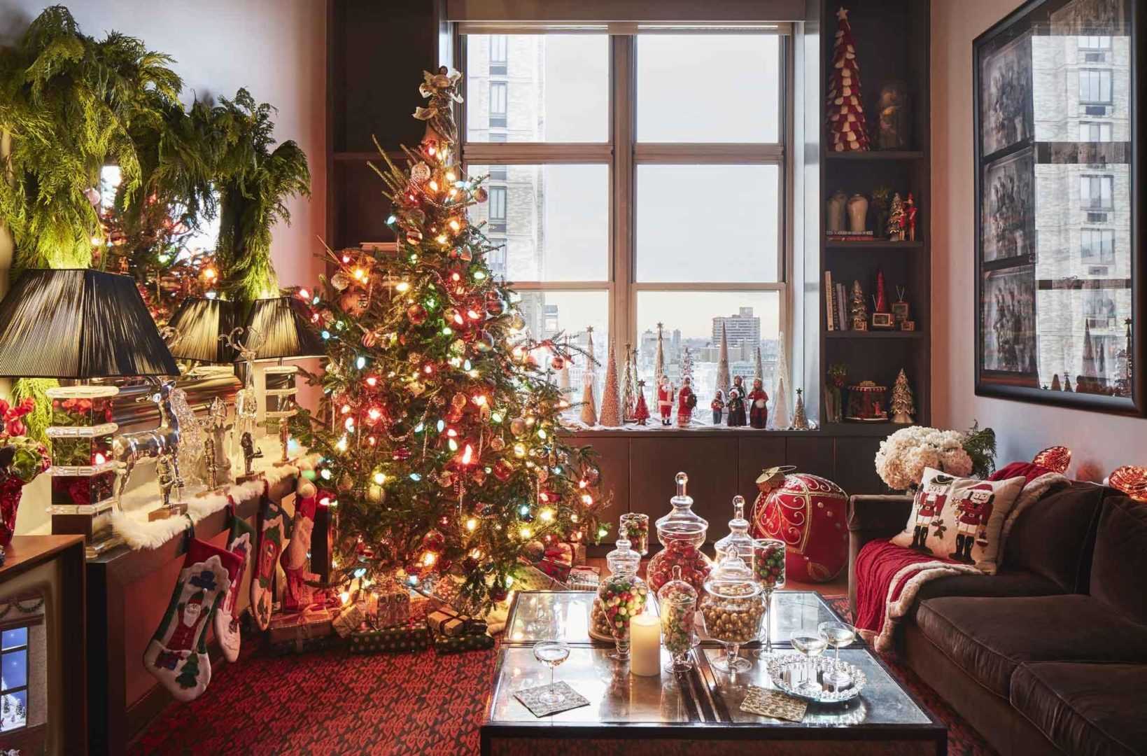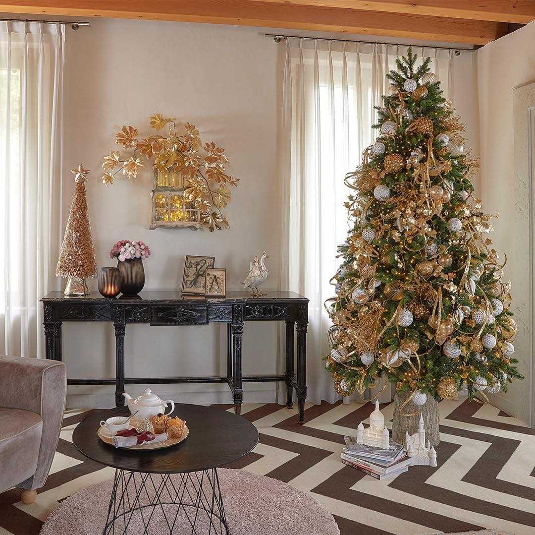 В гостевой комнате, как правило, все члены семьи собираются и проводят время вместе. Обычно в этой комнате и проходит праздник. Так как Новый год — это семейное торжество, украшать гостиную лучше полным составом.