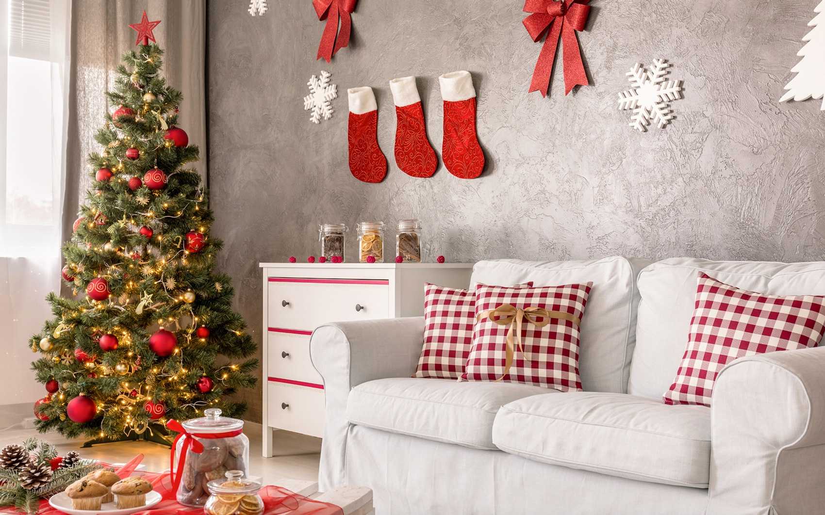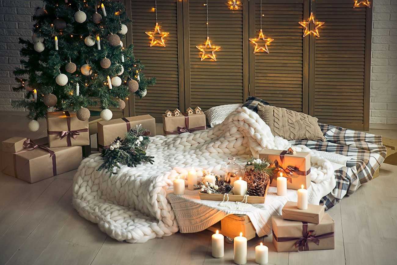 Красиво украсить комнату можно пледами, подушками, а также елочными веточками.