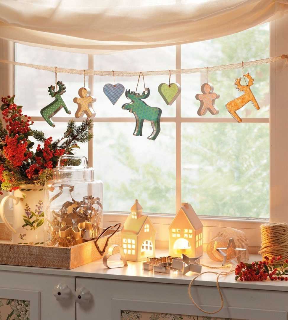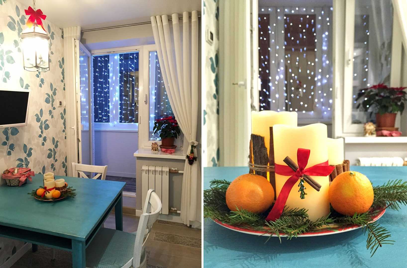 - Гирлянда. Это может быть сияющая электрическая, ароматная хвойная или креативная бумажная. Главное — уместно ее расположить. Чаще всего их размещают на окнах, шторах, стенах, полках.