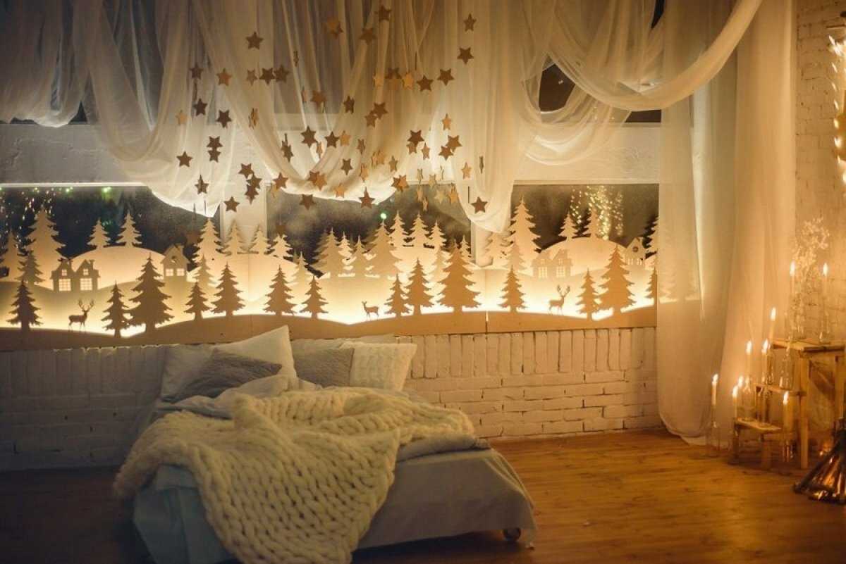Украсить спальню, кухню и другие имеющиеся помещения можно скромнее, чем гостиную или не украшать вовсе. Если зал будет красиво оформлен, то отсутствие декора в остальных комнатах не будет заметно. Чтобы добавить уюта, можно сделать бумажные снежинки и оформить ими окна. Чтобы создать больший антураж сказочности, можно добавить искусственный снег или блестки.