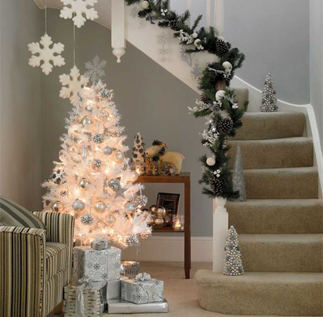 Украшая загородный дом необязательно использовать большое число украшений. Достаточно поставить ёлку в гостиную, и украсить основные комнаты в доме. Например, зал и кухню. Для декорации можно использовать свечи, статуэтки, мишуру, гирлянды, серпантин, фрукты и многое другое. Очень интересной идеей будет декорировать лестницу. По балюстраде можно пустить хвойную искусственную ветвь с ёлочными игрушками и гирляндой или повесить фигурки снежинок и ангелов. Если есть камин, то на нём будут прекрасно смотреться свечки, статуэтки и носочки для подарков, от которых дети пребывают в восторге.