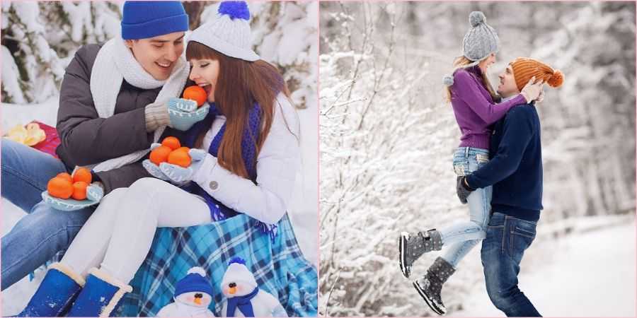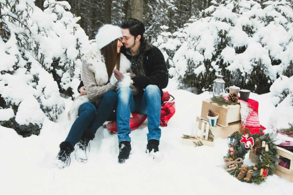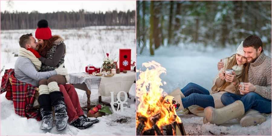 Не помешает захватить термос и теплый плед, на котором можно устроить зимнее чаепитие. Выглядит очень романтично и хорошо подходит для зимней love story влюбленной пары.