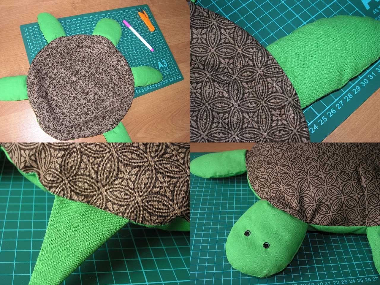 - Сшейте круглые лоскутки, формируя панцирь, оставьте отверстия для набивки и соединения лап и головы.