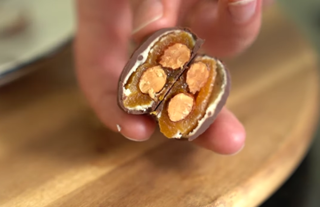 - Пока шоколад остывает, начиняем курагу миндалем, в каждую помещаем 1 или 2 орешка, все зависит от ее размеров.