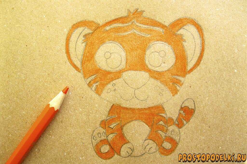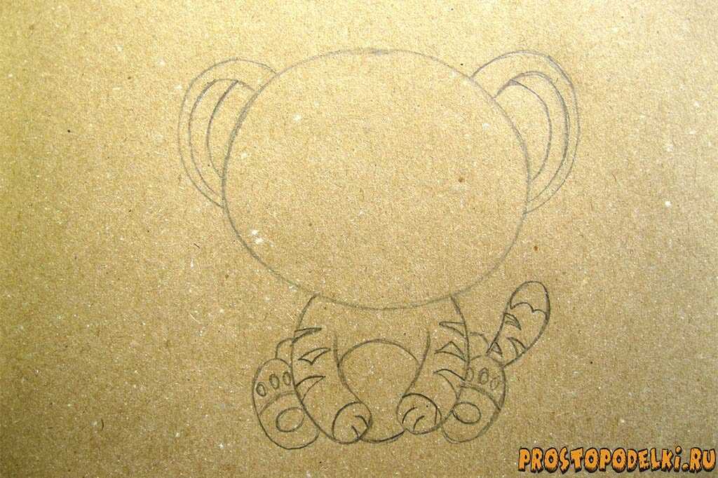 А если к этой морде вы хотите нарисовать тигриное туловище, то можете сделать тоже по-детски — как на примере ниже. Мультяшный тигр просто сидит на попе, ножки в стороны… медитирует.