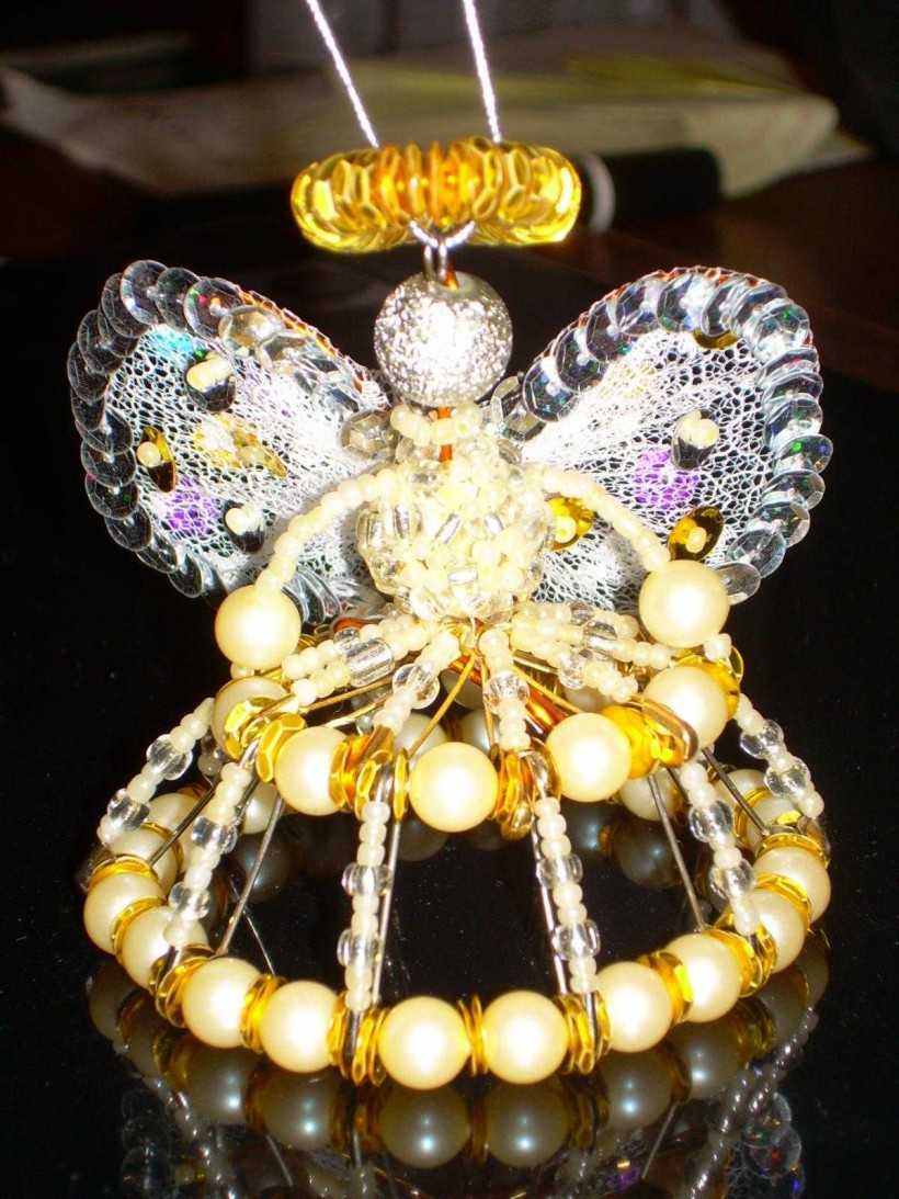 Для тела нужно белые бусины нанизать на проволоку и укладывать их по кругу, постепенно уменьшая количество. Перехватить между собой ряды тонкой ниткой. Крылья делаем из цепочки золотых бусин, можно нанизать их на тонкую проволоку. Из золотых бусин делаем нимб и ручки, а головкой Ангела будет перламутровая бусина.