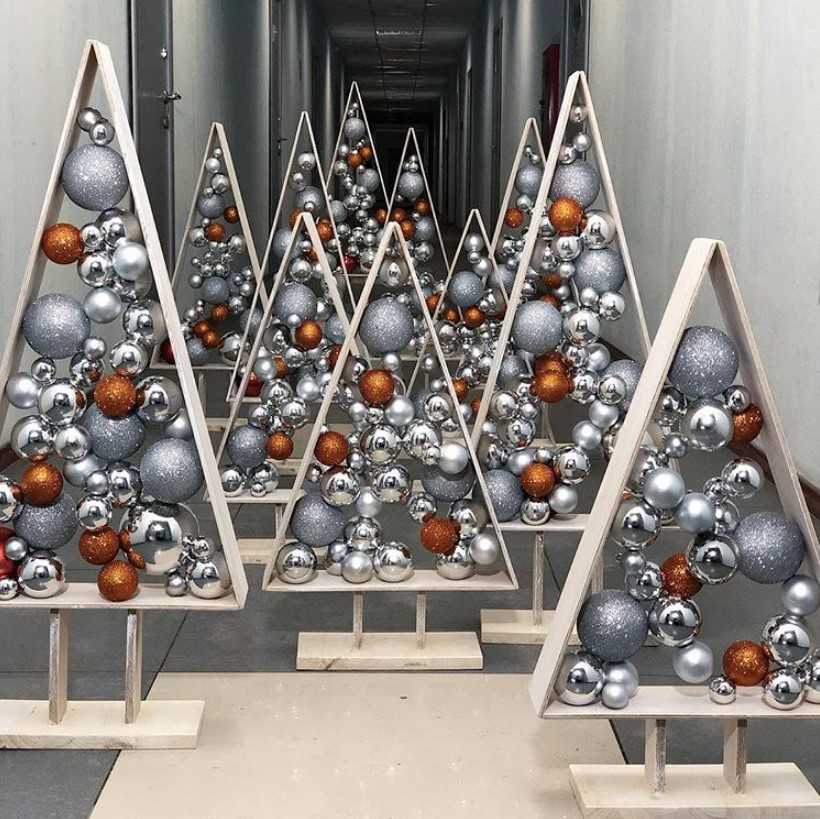 Так, можно поставить небольшую елочку и украсить ее несколькими шарами, незамысловатой гирляндой. Очень эффектно смотрятся квадратные, треугольные украшения. На пике популярности елки из дерева. Это просто заготовка в виде ели, на которую можно повесить несколько шаров.