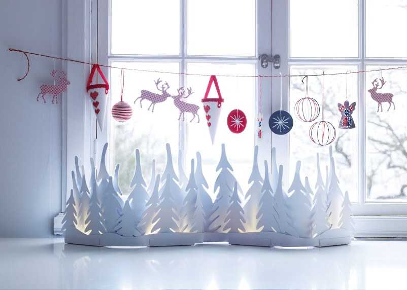 Не только ткань может идти вход при оформлении таких поверхностей. С помощью белой бумаги или картона можно создать целый зимний пейзаж, который будет простираться по всей ширине окна. На фото подоконника – простейший пример: небольшие елочки, соединенные друг с другом. Добавьте несколько деталей сверху – и декор готов!
