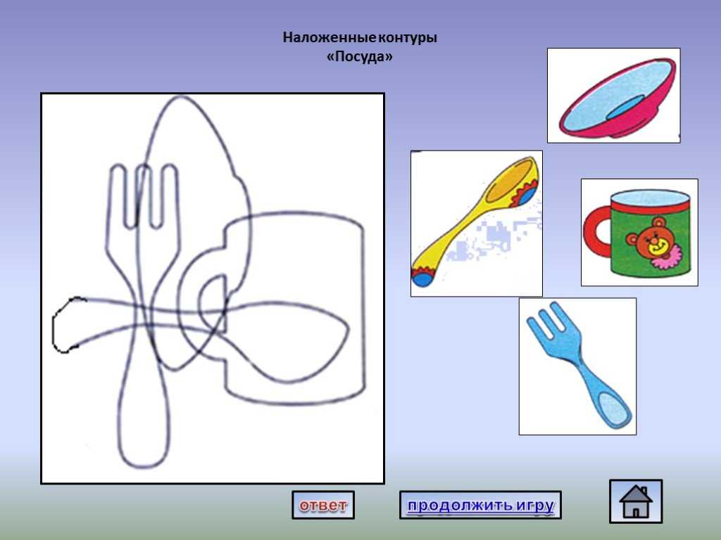 Когда малыш освоится с названиями кухонных предметов, необходимо усложнить задание и попросить найти лишний или отличающийся предмет среди посуды. Используем картинки для детей: