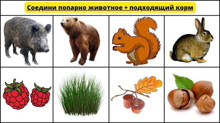 Дети, рассмотрев картинки, должны соединить их попарно «животное + подходящий корм». Например, «кабан + желуди», «медведь + малина», «белка + лещина», «заяц + трава».