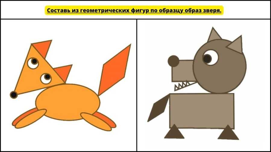 Педагог раскладывает перед воспитанником вырезанные из бумаги геометрические фигуры, просит составить из них по образцу образ зверя или птицы. Ребенок, хорошо справляющийся с заданием, может пофантазировать: попробовать составить изображение не по шаблону, а по собственному представлению.