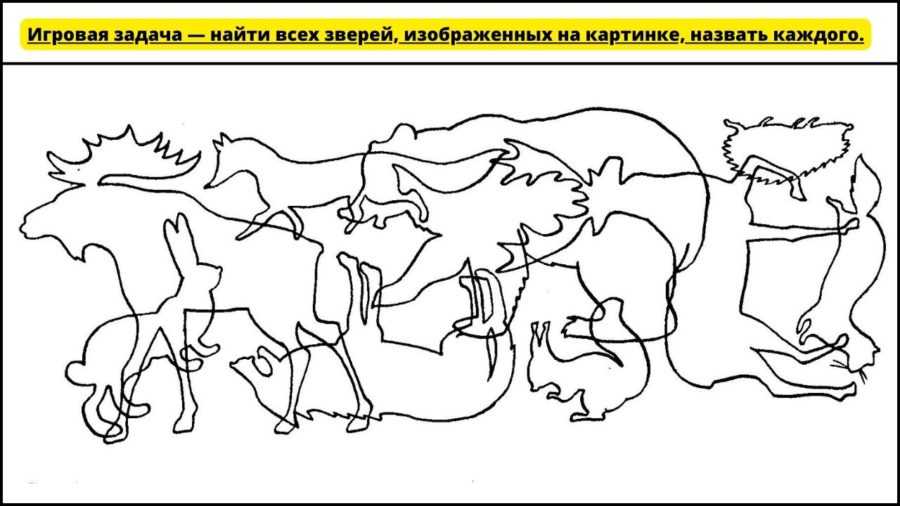 Игра развивает концентрацию внимания, воображение, мыслительные способности. Для занятия необходимы карточки, изображающие наложенные друг на друга контуры зверей.