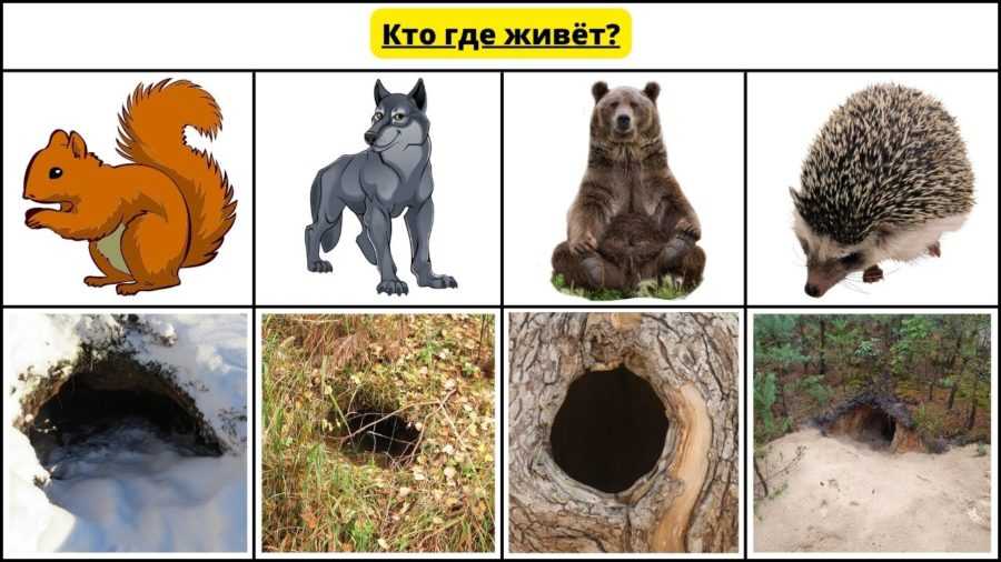 Педагог закрепляет на доске карточки, на которых изображены лесные животные. На столе перед воспитанниками раскладывает изображения разных звериных жилищ. Каждый игрок по очереди берет картинку жилища, ставит под изображением зверя, который в нем живет. При этом развернутой фразой говорит, где обитает животное. Например: «Белка живет в дупле», «Бобр живет в хатке», «Медведь живет в берлоге».