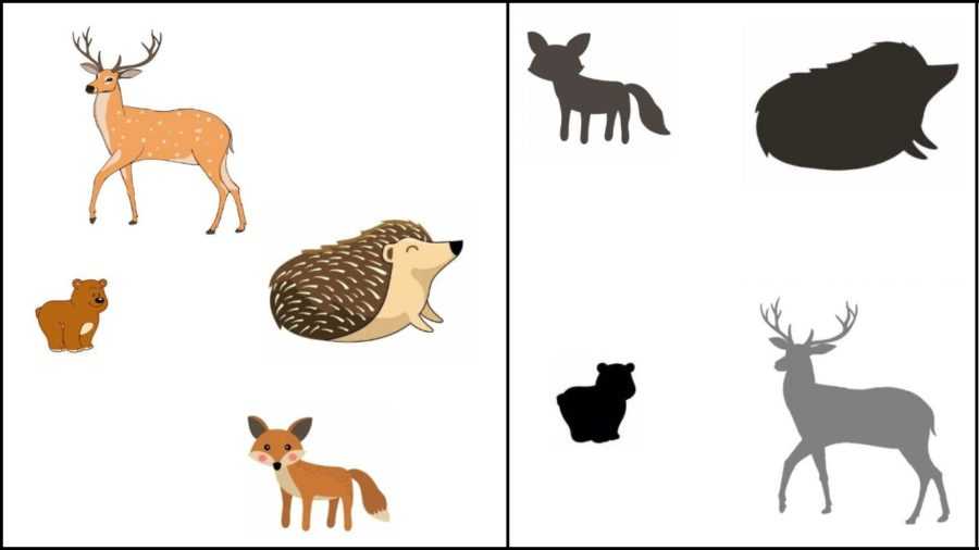 Игровая задача — подобрать к каждому изображению зверя идентичный силуэт, соединить их нарисованной карандашом или фломастером линией.