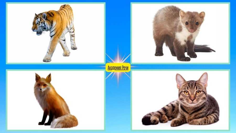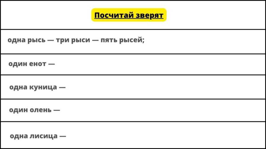 Педагог называет животное. Воспитанники называют этих же зверей в количестве трех и пяти особей. Например: