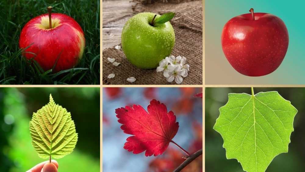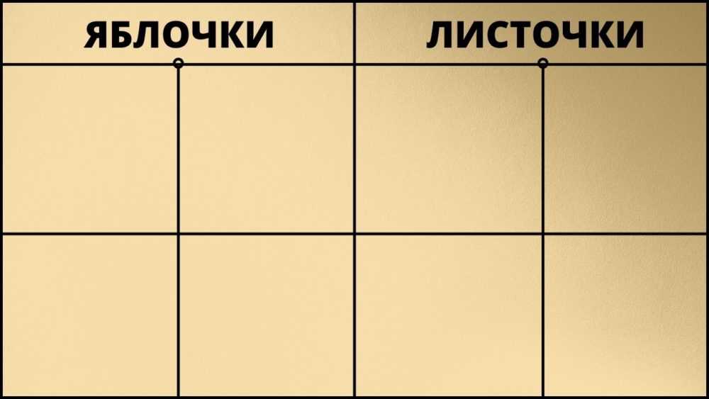 Для игры подготовьте таблицу с 2-мя ячейками: первую подпишите «яблочки», вторую – «листочки». Также вырежьте изображения яблок и осенних листьев разных форм, цветов и размеров. Попросите воспитанника правильно распределить объекты по ячейкам.
