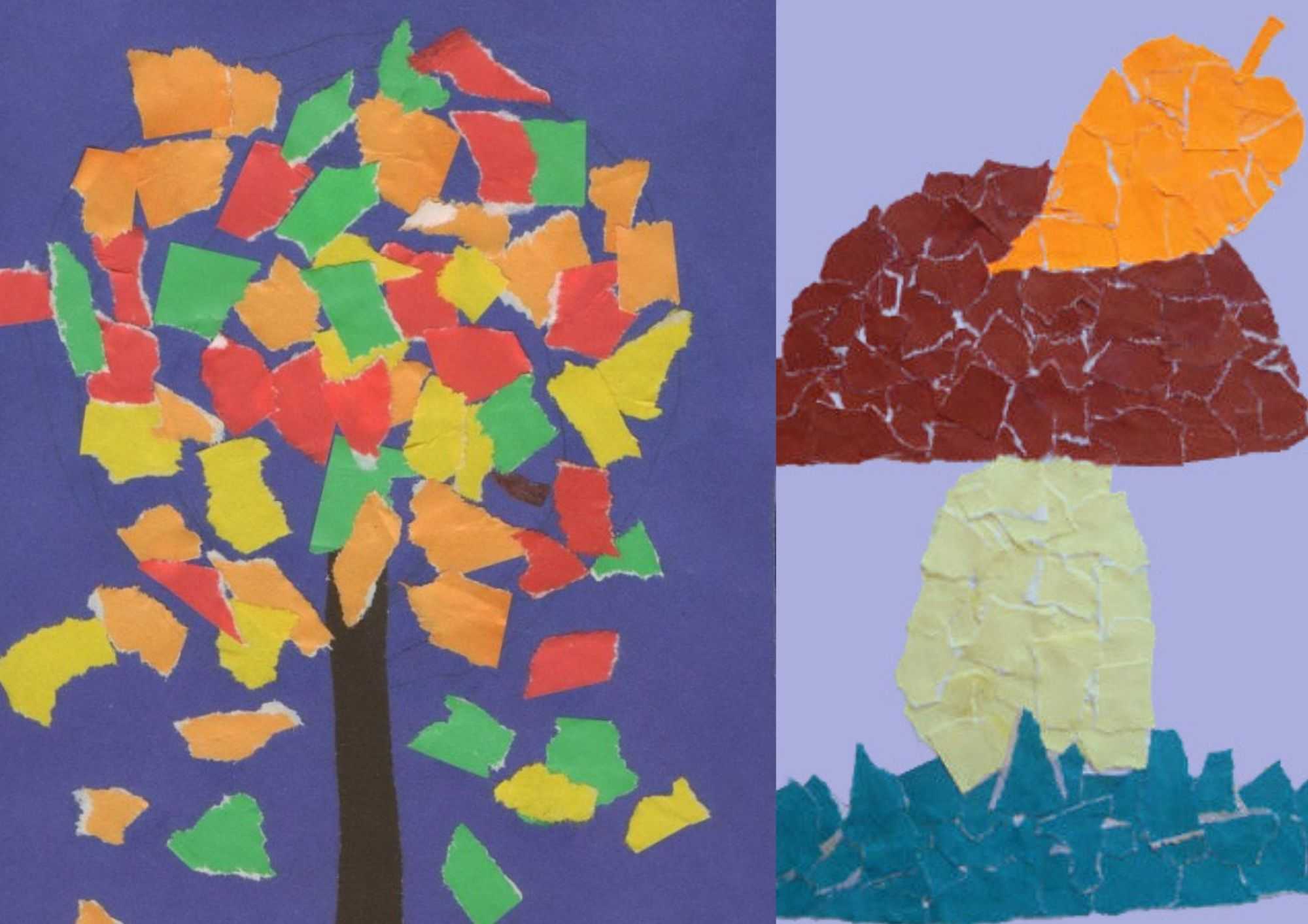 Это хороший вариант поделки для детей 2 лет и меньше. Изначально можно просто приклеивать разные по размеру кусочки бумаги на основу, и даже без какой-либо композиции, такая работа точно понравится малышу. Ребенок оценит не результат, а сам процесс. А вот подключать художественное видение и фантазию нужно будет уже после того, как будет немного отработан навык наклеивания.