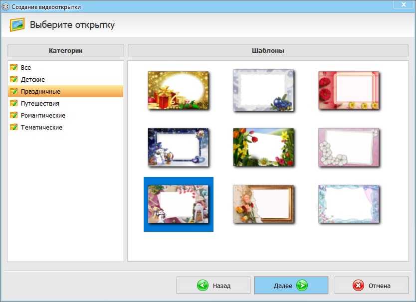 Теперь нужно выбрать оформление. ВидеоМОНТАЖ предлагает варианты рамочек на разные темы и торжественные события. В категории «Праздничные» вы сможете найти новогодние шаблоны.