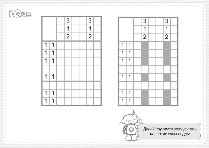 Всё популярнее становятся японские кроссворды для детей. Такие головоломки уже можно предлагать детям, начиная с 6 лет.