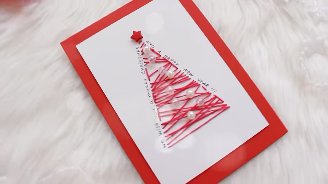 Это креативный вариант классического представления о символе Нового года. Аппликация выполнена в минималистическом стиле. Красный и белый цвет отлично сочетаются с перламутровыми бусинами. От этого дизайна открытка становится более изысканной. Алгоритм выполнения состоит из пары шагов. С ним справится даже тот, кто не умеет шить.