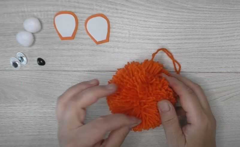 Из желтого кусочка сделать мордочку и зубочисткой поставить точки. Из оранжевого пластилина сделать ушки. Прикрепить к морде.