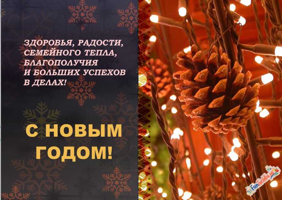 Новый год… Примите поздравления! Пусть он будет радостным для всех, Пусть здоровы все родные будут, Ожидает радость и успех! Сбудутся пусть все ваши желания, Жизнь будет богатой и без бед. Вам здоровья, благ и процветания, Веры и любви на много лет!