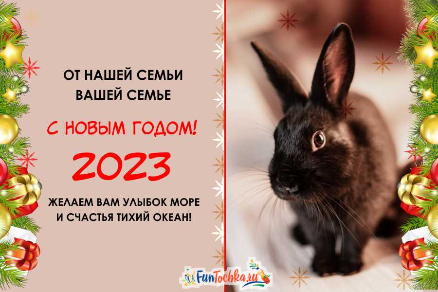 Любимой семье мы адресуем не одного, а целую семейку прикольных кроликов. Пожелания с Новым 2023 годом могут включать упоминания материального достатка и здоровья.