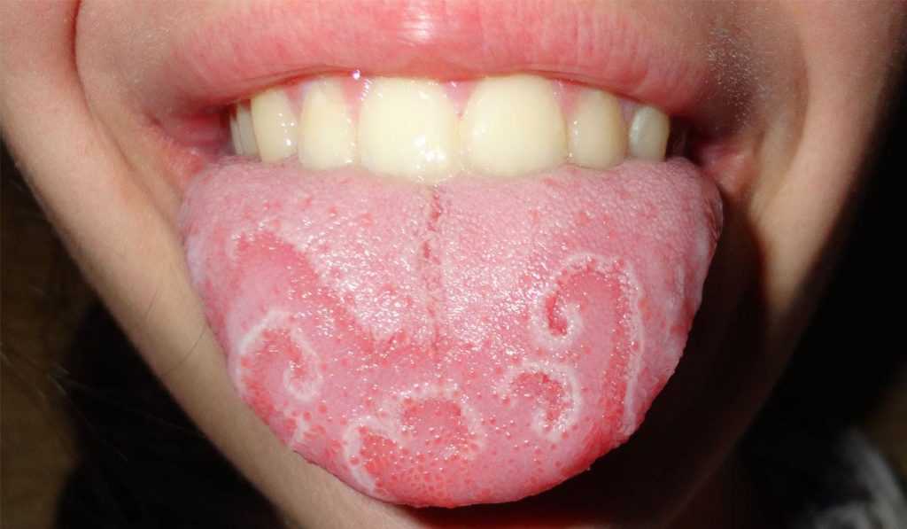 На слизистой языка возникают пятна, имеющие красную окраску и обрамлённые белым или жёлтым налётом. Они склонны менять форму и локализацию. Эти изменения являются безболезненными и не опасными. Чаще всего их появление связано с хроническими болезнями пищеварительной системы, аллергическими заболеваниями, глистной инвазией, гормональными изменениями, а в некоторых случаях и с психическими расстройствами.