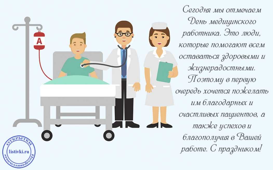 Поздравляю всех медицинских работников с праздником! Пусть ваш белый халат и запах лекарств прогонят все болезни не только от вас, но и от всех ваших родных и близких. Всегда оставайтесь здоровыми, будьте довольны жизнью, и пусть ваша счастливая карьера возьмет свое. Дарите здоровье людям, и пусть ваша доброта вернется к вам потоком благодарности. Успехов во всех делах, жизни в изобилии и профессиональной деятельности на долгие годы!
