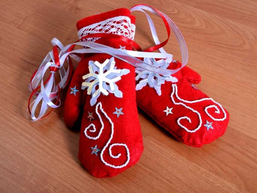 Рукавицы у Деда Мороза волшебные, по цвету его шубы, шапки и они обязательно нарядные, с вышивкой из белых узоров.
